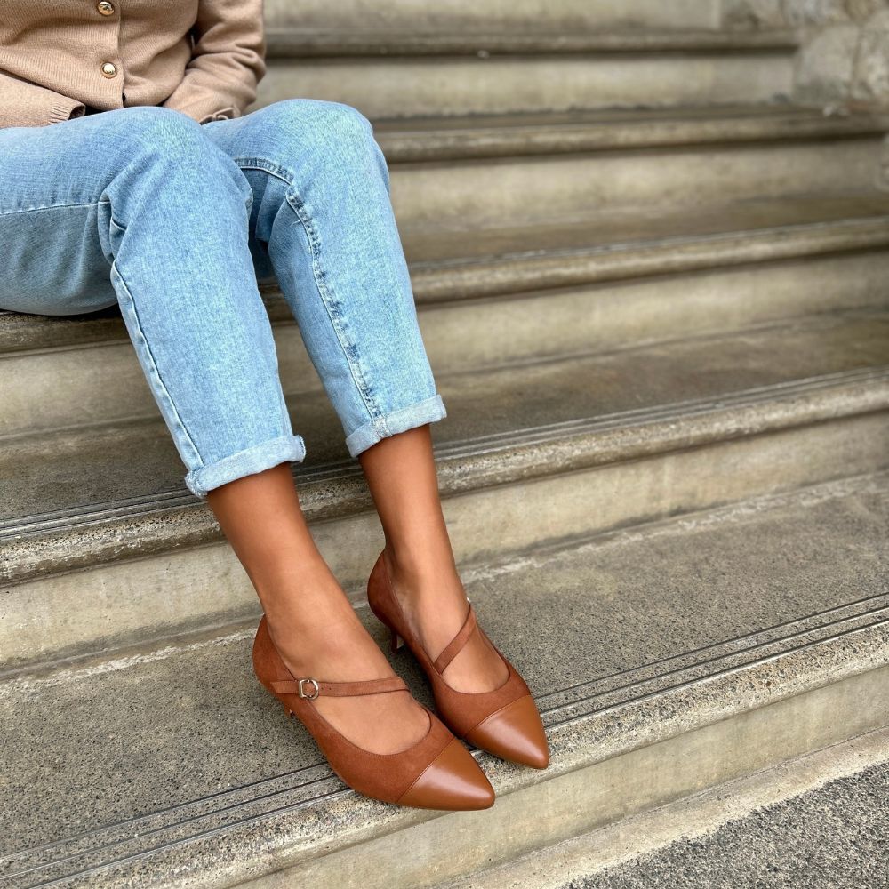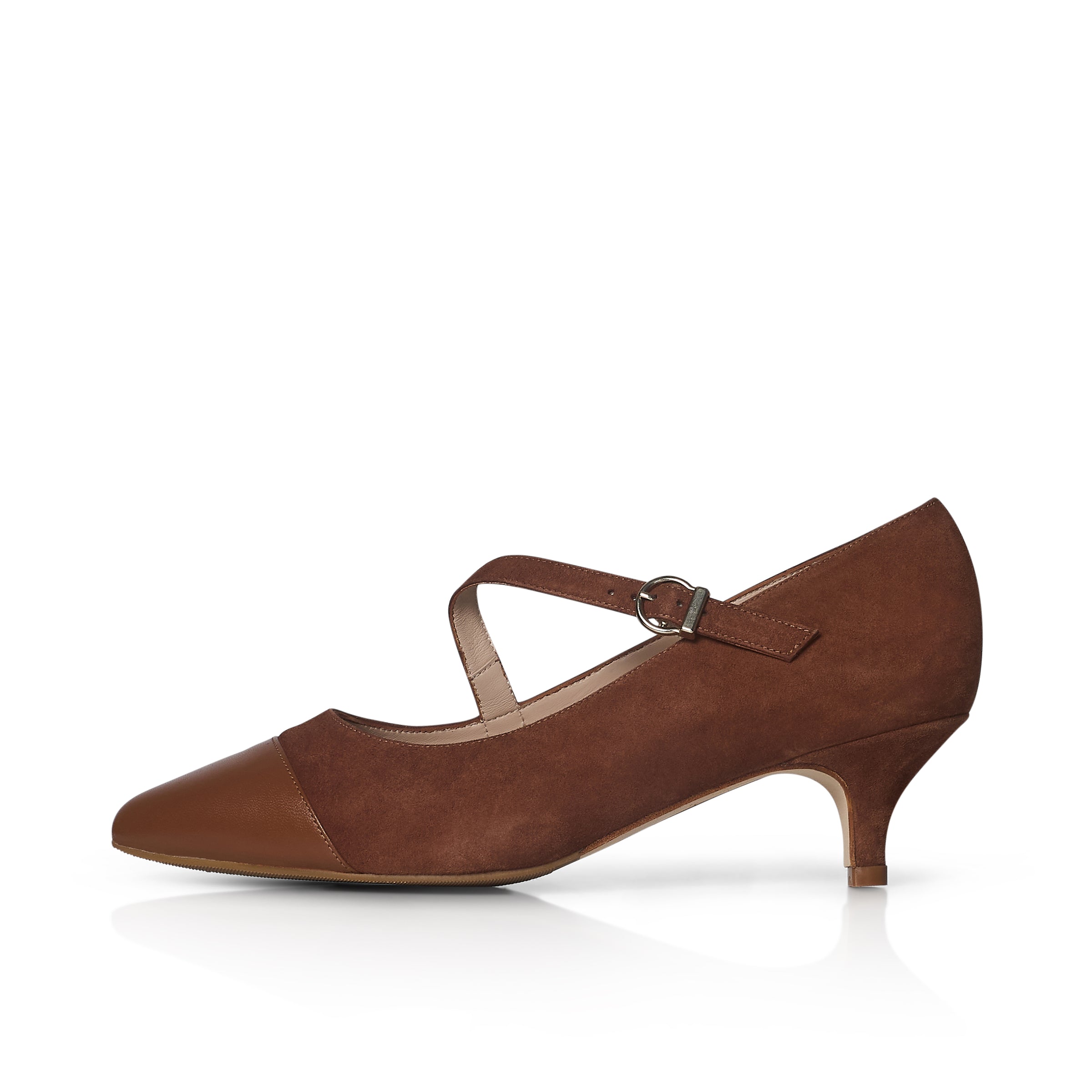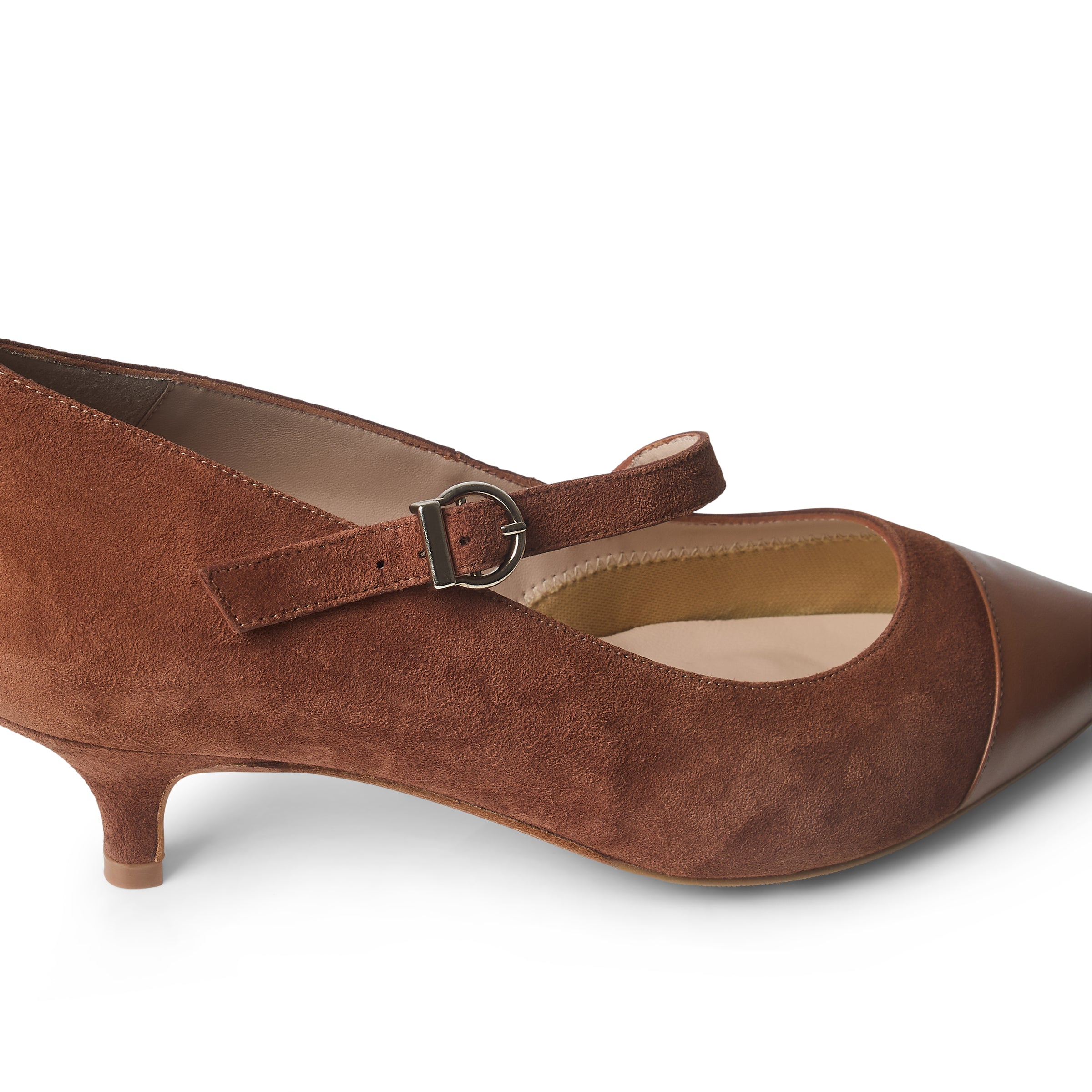 Introducing the Ally Extra-Wide Fit Heels in luxurious tan suede. These sophisticated kitten heels combine modern design with exceptional comfort, featuring a bold contrast leather toe cap and an elegantly angled buckle strap for a contemporary look. Made with a generously sized toe box, they include our signature Smooth & Soothe hidden foam panel—a discreet cushioning system designed to gently support bunions and tender toes. Enjoy the perfect mix of style and comfort, where irritation is eliminated and ease takes centre stage.