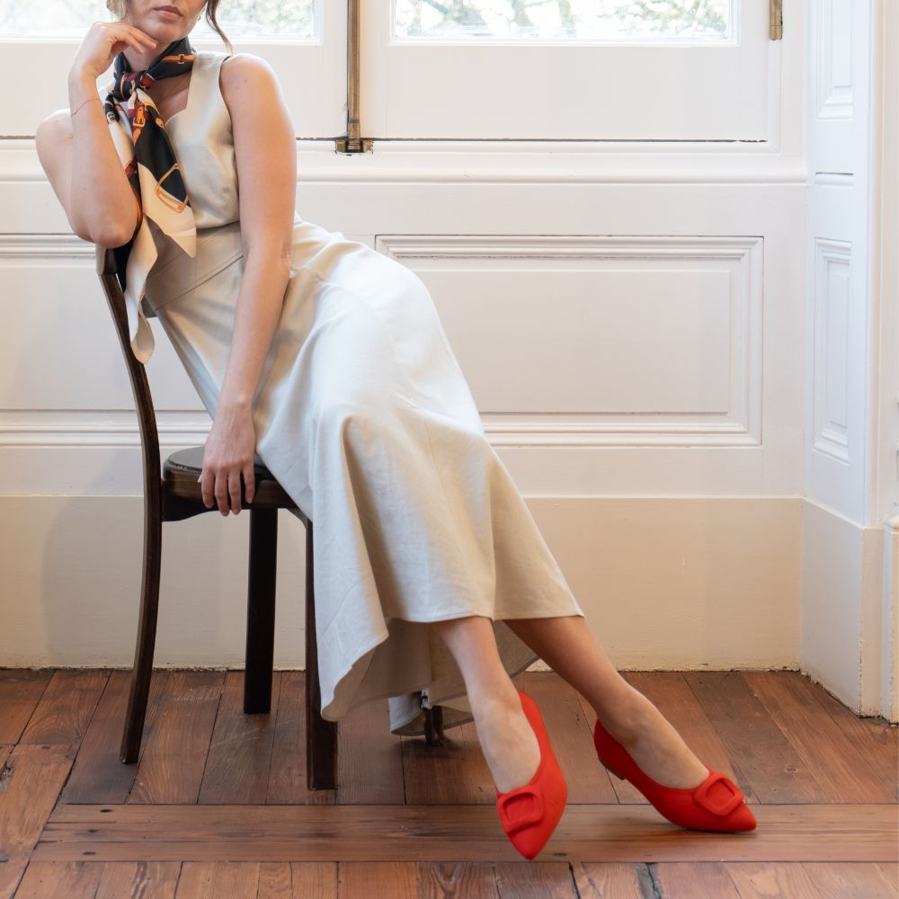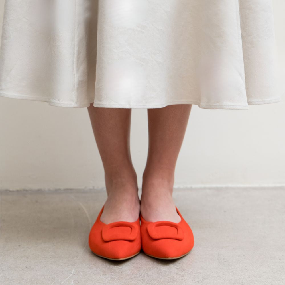 Veronica Extra Wide Buckle Pointed Flat - Coral Red Suede