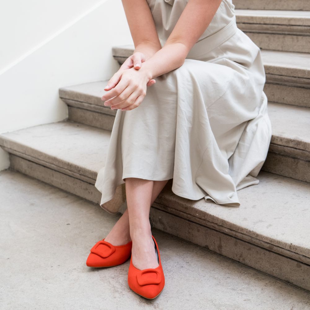 Veronica, a sophisticated pointed flat designed specifically for those who require extra room and support without compromising on style. Beautifully crafted from soft coral suede with an elegant oversized, leather-wrapped buckle detail, providing a chic, tonal texture.